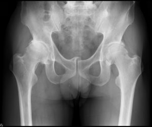 こちらが術前のレントゲン写真です。右股関節の軟骨が無くなって関節の隙間が消失しています。