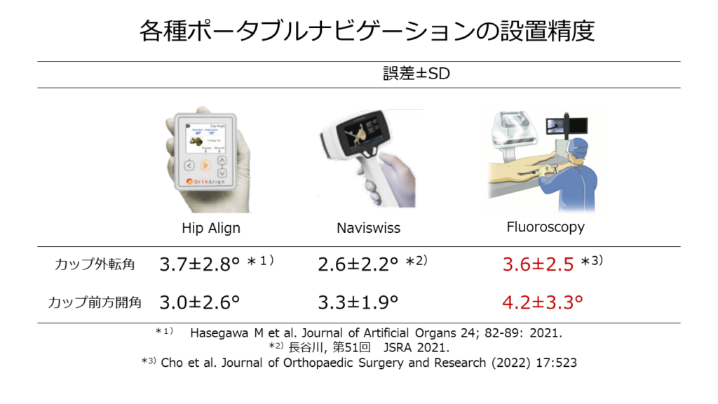 一般的に使用しやすいポータブルナビゲーションシステムの設置誤差は約3度であります。一方、術中X線透視装置を使用した設置誤差は約3~4度であり、各種ナビゲーションシステムと比較して全く遜色ない結果であることを2022年に英文雑誌にて報告しました。