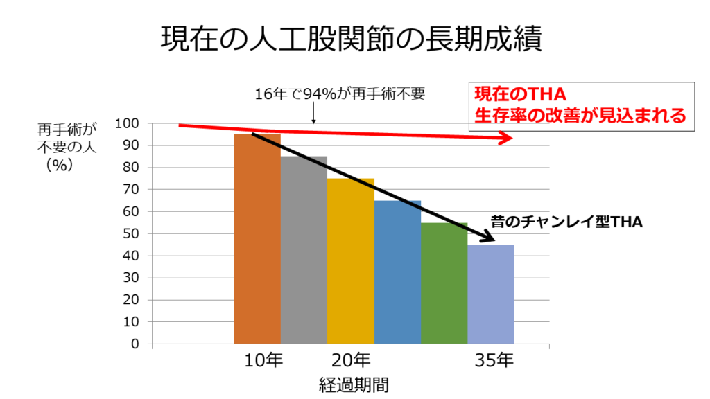 2000年頃に起こった技術革新により、それ以降の機種に関しては長期の耐久性が格段に進歩しました。わが国に導入されてからはまだ20数年程度しか経過していませんが、欧米ではすでに30年以上の長期の成績が報告されています。最近報告された最も長期の成績では術後32年を経過した患者さんのうち、人工関節がゆるんで再手術を必要とした患者さんはわずかに1%であったと報告されています。