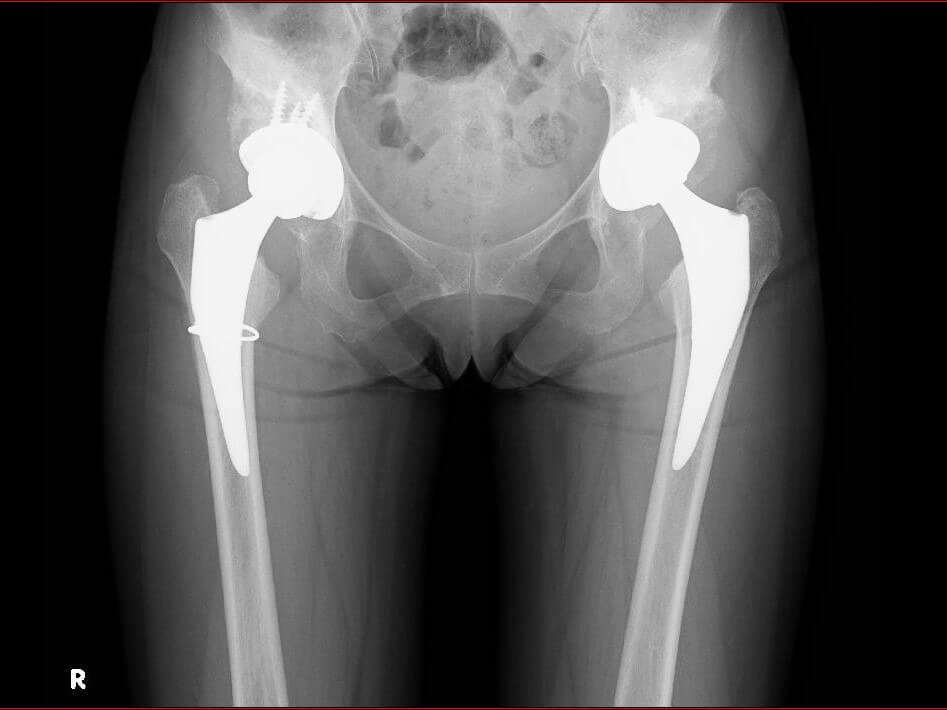 こちらは、54歳の両臼蓋形成不全の患者です。 仰臥位前外側アプローチ(ALS THA)の両側同時手術で人工股関節を設置しました。...