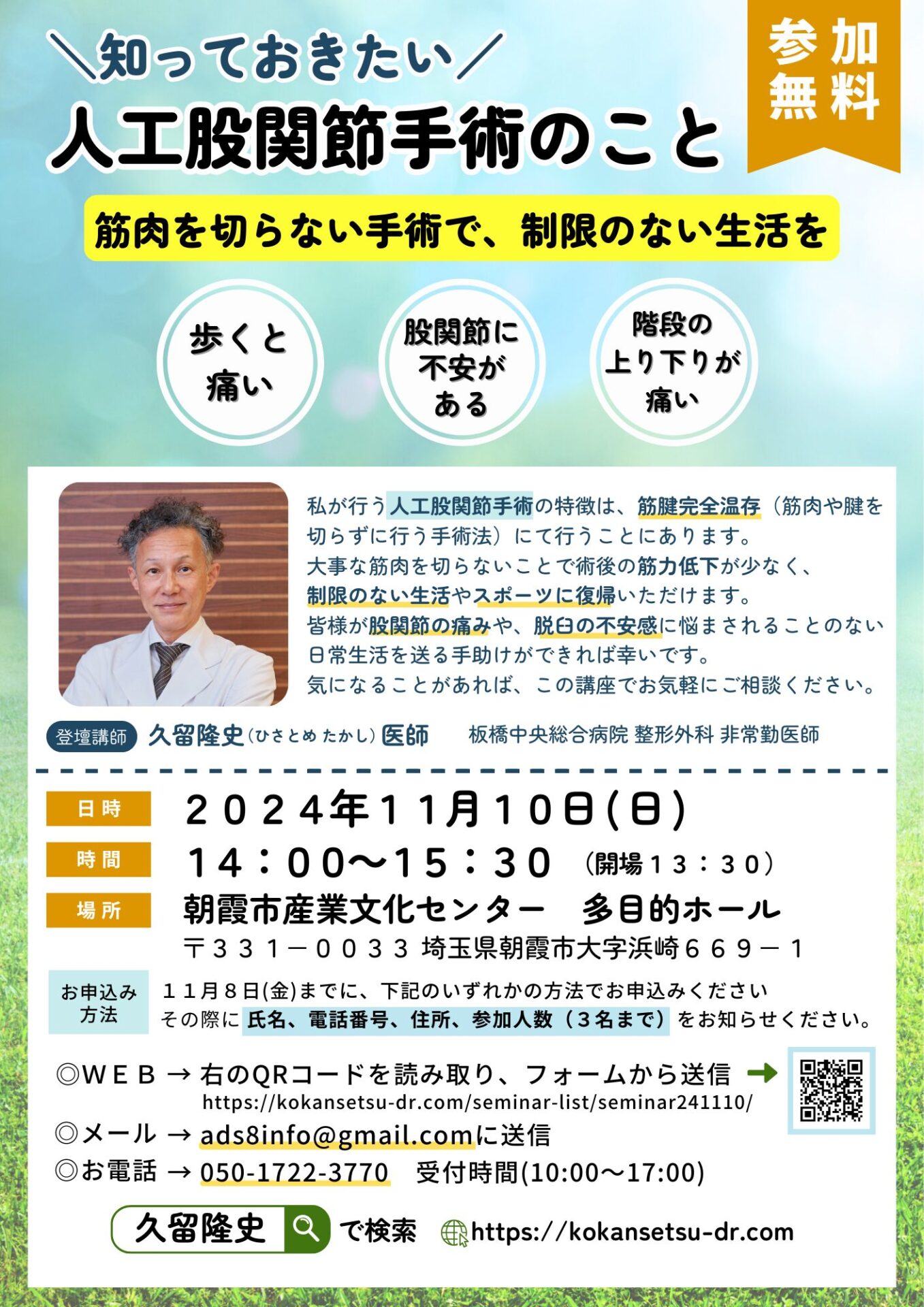 市民公開講座(セミナー) 【2024年11月10日(日)埼玉県朝霞市】人工股関節手術の健康講座 参加申込 2024.11.10 本セミナーは終了しました。 読み込んでいます… Post Share Hatena Pocket RSS feedly Pin it 股関節の痛みと原因 前の記事 ロッククライミングへの復帰例 次の記事