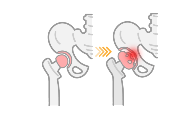股関節は胴体と脚を繋ぎ、体全体を支える関節です。胴体(骨盤)側の丸いくぼみに、脚(大腿骨)側の球体の骨がはまり込む作りをしていて、骨の間にある軟骨がスムーズに動く手助けをしています。しかし、加齢や肥満、過度な運動などが原因で、負担がかかると、軟骨はすり減っていきます。